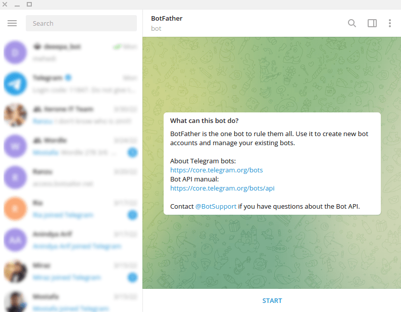 To build a Telegram bot with Chatnblast, first, open your Telegram App. Then in the search bar of the app, search with the ‘BotFather’ keyword. Then select the verified BotFather account.