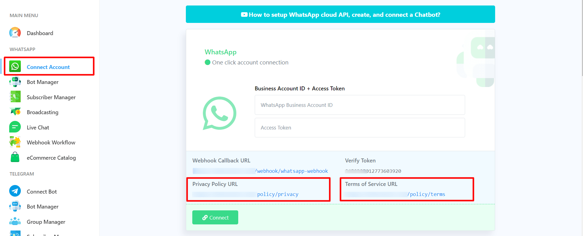 To get the callback URL and verify the token from Chatnblast. Login to your account and go to the dashboard of Chatnblast. At the left sidebar of the Dashboard, under the WhatsApp section, you will see connect WhatsApp option. Now click on the connect WhatsApp menu and instantly, Connect WhatsApp Business page will appear.